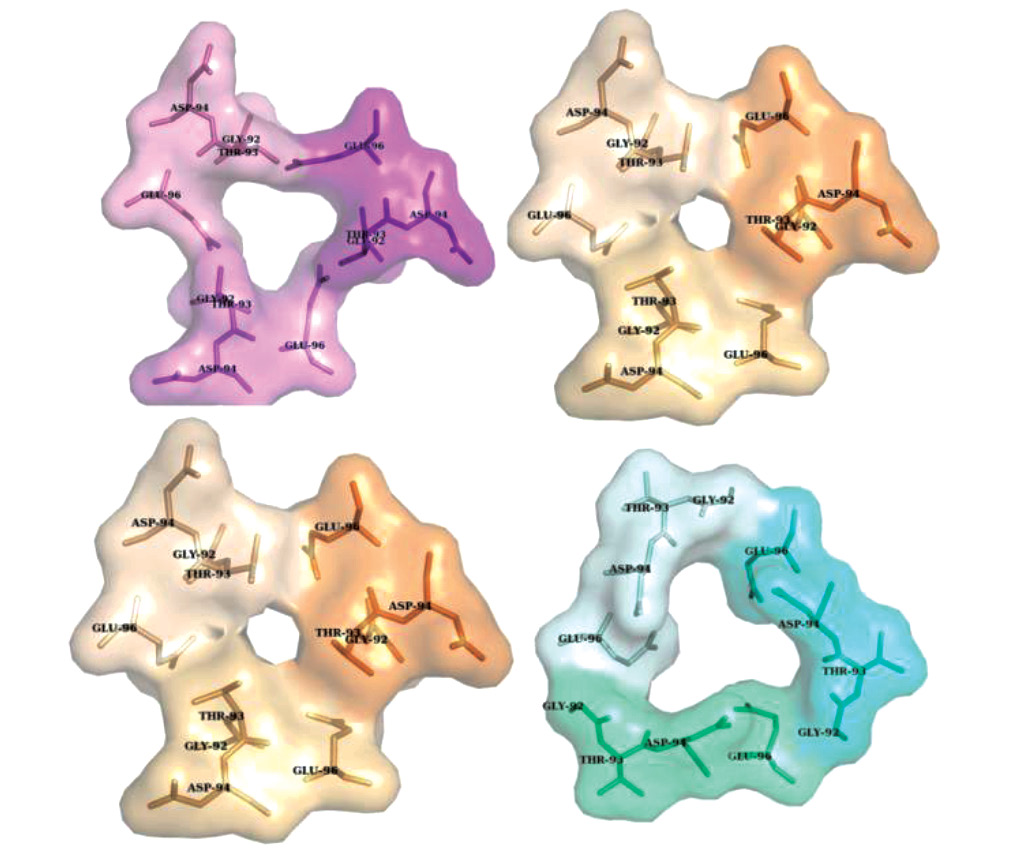 Мутантная форма аспарагиназы Wolinella succinigenes (WASm), которая содержала две замены V23Q и K24T в подвижной петле, ограничивающей активный центр, и обладала на порядок меньшей по сравнению с исходным ферментом глутаминазной активностью при полном сохранении аспагагиназной, была получена в 2016 г. группой исследователей из Государственного научно-исследовательского института генетики и селекции промышленных микроорганизмов [44]. Чтобы проследить, каким образом введенные замены влияют на соотношение активностей, были определены пространственные структуры апоформы мутанта и его комплексов с аспарагиновой и глутаминовой аминокислотами. Структура апоформы фермента уточнена при разрешении 1.7 Å, структуры комплексов WASm/Asp и WASm/Glu при 1.65 и 2.0 Å соответственно [45]. Оказалось, что три субъединицы тетрамерной молекулы WASm/Asp находятся в каталитически активной, закрытой конформации, в то время как в комплексе WASm/Glu все четыре субъединицы имеют неактивную открытую форму. Моделирование положения а. о. Gln23 и Thr24 с использованием координат исходного фермента (PDB ID: 5K3O) показало, что боковые цепи а. о. образуют ряд коротких контактов с соседней субъединицей димера. Это может увеличивать подвижность петли и препятствовать образованию закрытой конформации при связывании субстрата большего объема: глутамина. Кроме того, после введения замен V23Q, K24T существенно меняется и электростатический потенциал поверхности на данном участке пространственной структуры.