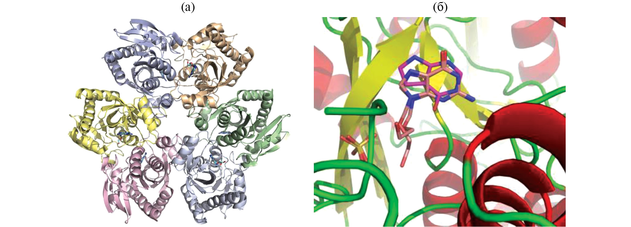 Рис. 7. Пространственная структура гексамерной молекулы ПНФ в комплексе с ацикловиром (PDB ID: 5I3C) (а). Сравнение положения ацикловира и 7-диазагипоксантина в активном центре фермента (б)