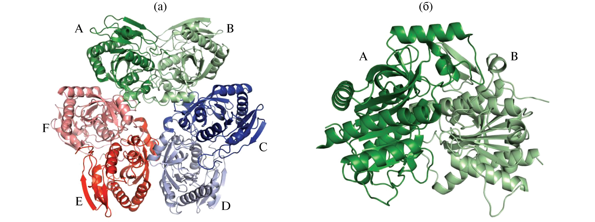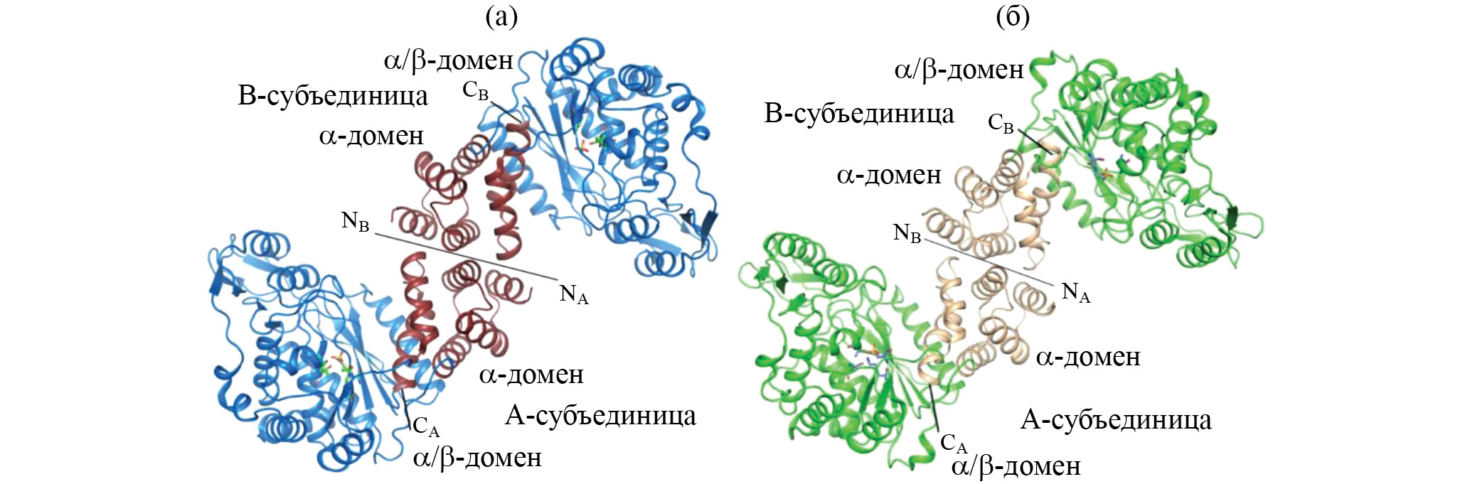 Рис. 8. Трехмерная структура молекул уридинфосфорилаз: а – бактериальная УНФ из E. coli, б – человеческая УНФ 1-го типа [89]