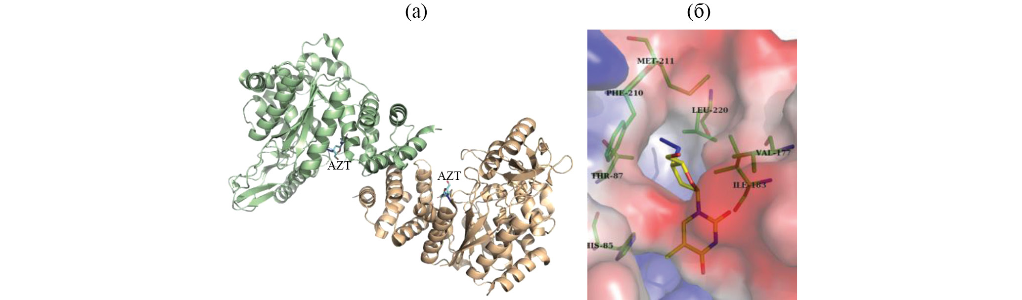 В [102] для анализа комплекса VchUPh с 2.2´-ангидроуридином, решенного методом РСА (1.34 Å), для вычисления энергии связывания белок–лиганд были применены методы линейной интерполяции и возмущения свободной энергии, основанные на полноатомной МД. Проведено сравнение этой структуры со структурой комплекса с субстратом – уридином (рис. 9а). Показано, что молекула 2,2´-ангидроуридина образует с активным центром фермента меньше устойчивых водородных связей, а их длина больше, чем в случае с уридином. Однако в расчетах, учитывающих энергию сольватации молекул и энтропийные эффекты, связывание ингибитора (2,2´-ангидроуридина) с активным центром белка оказалось энергетически выгоднее, чем нативного субстрата.