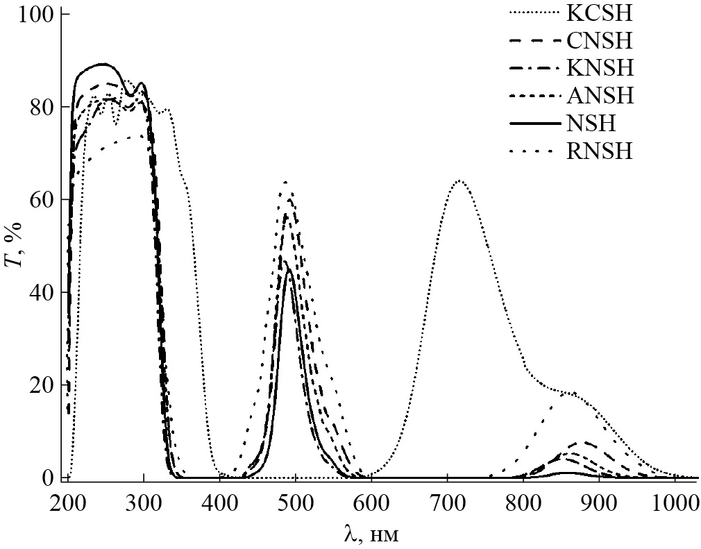 В настоящее время в качестве оптических фильтров в приборах ССТ успешно применяются кристаллы гексагидратов сульфатов кобальта и никеля: α-NiSO4 · 6H2O (α-NSH), K2Ni(SO4)2 · 6H2O (KNSH), (NH4)2Ni(SO4)2 · 6H2O (ANSH), Rb2Ni(SO4)2 · 6H2O (RNSH), Cs2Ni(SO4)2 · 6H2O (CNSH), (NH4)2Co(SO4)2 · 6H2O (ACSH) и K2Co(SO4)2 · 6H2O (KCSH), которые прозрачны в области 200–300 нм и имеют полосы поглощения в УФ-, видимом и ближнем ИК-диапазонах.