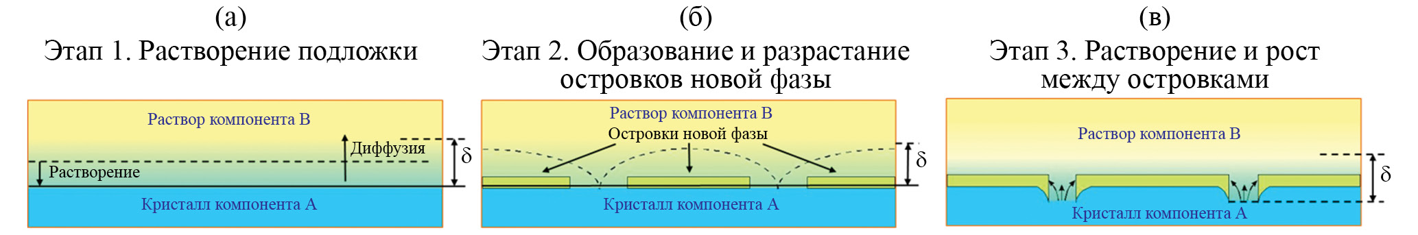 Весь процесс можно разделить на три стадии (рис. 4): первичное растворение подложки и образование пограничного слоя пересыщенного раствора, осаждение и быстрый рост островков, дальнейший медленный рост островков в сочетании с растворением подложки между ними. Подробно модель процесса рассмотрена в [57].