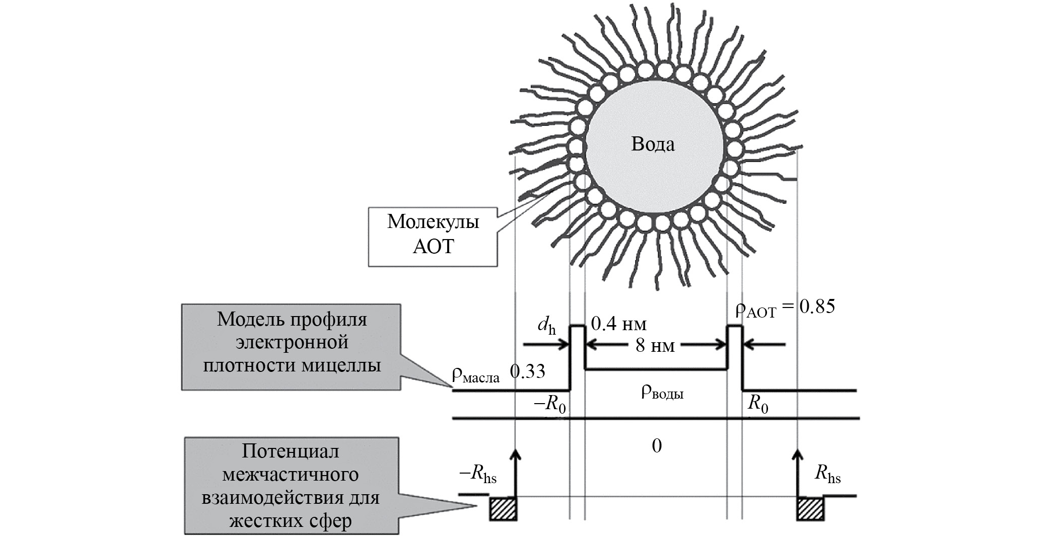 Рис. 2. Модель сечения мицелл АОТ–вода. Плотность ρ представлена в единицах электрон/Å3. Rhs – потенциал слипаемости (hard sticky potential radius). dh – толщина слоя, занятого сульфатными группами ПАВ