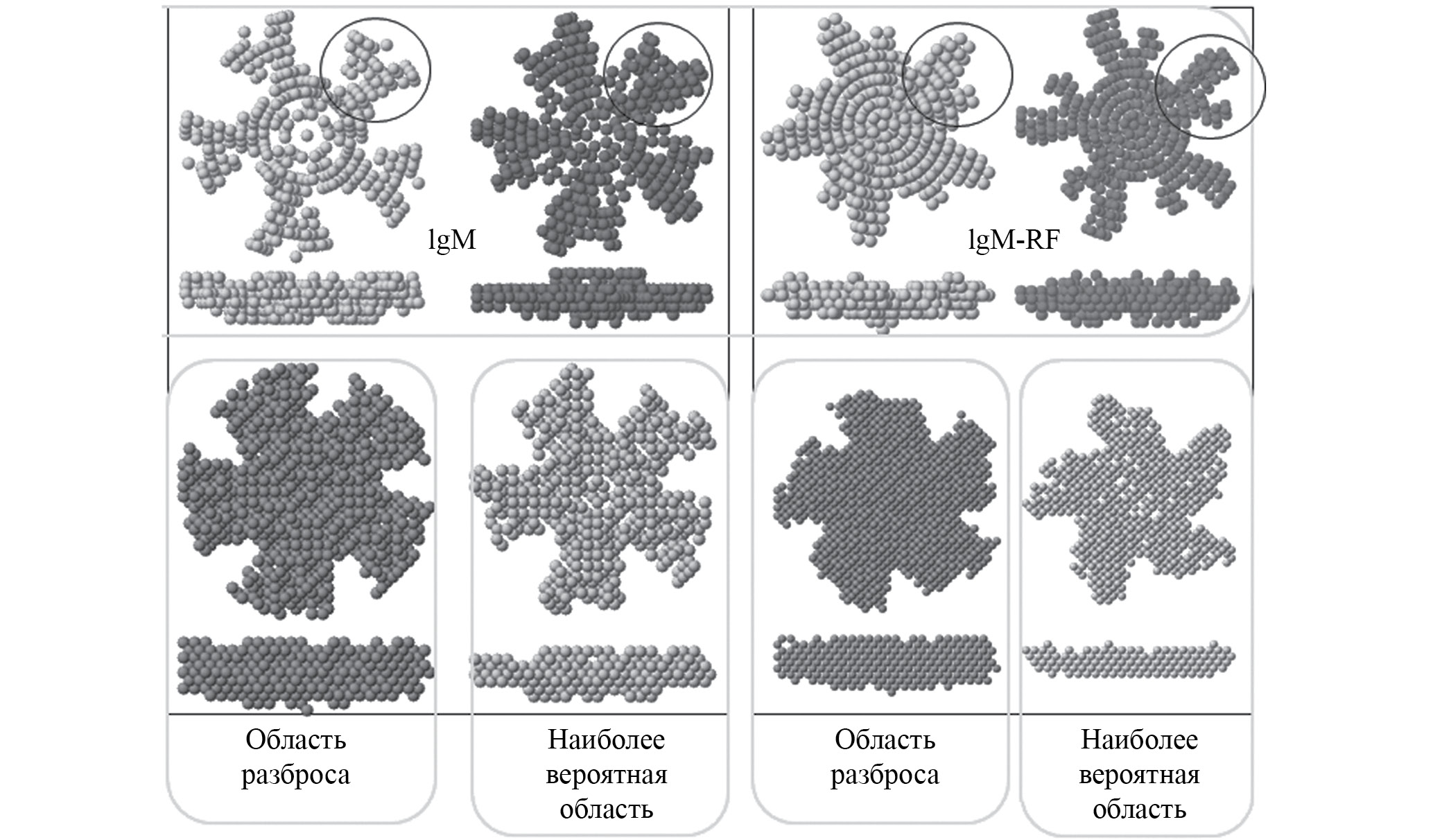 На рис. 6 в качестве примера показаны результаты моделирования структур IgM и IgM-RF [22]. Ревматоидный фактор отличается от IgM тем, что в нем оказывается активным неспецифичный центр связывания, активность которого блокируется в IgM стерическими особенностями строения. Одной из гипотез было предположение, что периферийные Fab-фрагменты в IgM-RF неполные, что снимает блокировку неспецифичного центра. Однако выделенные из обоих типов молекул Fab-фрагменты по данным МУР оказались идентичными с точностью до ошибок измерений. Более того, шариковые структуры обеих полных молекул имели одинаковые объемы. Тем не менее в найденных структурах были заметные различия в области Fab-фрагментов: в молекуле IgM-RF они оказались несимметричными. Предполагалось, что в ревматоидном факторе гибкость этих фрагментов значительно выше, что дает возможность неспецифичному центру открываться и взаимодействовать с антигенами к собственным белкам организма. Впоследствии эта гипотеза была подтверждена методом электронного парамагнитного резонанса [22].