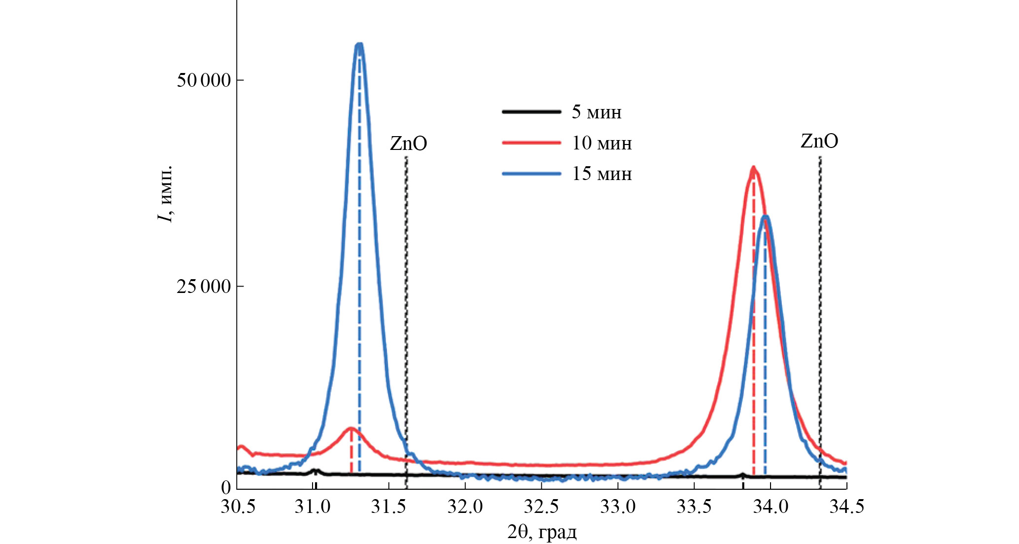 Рис. 3. Рентгеновские дифрактограммы микрокристаллов ZnO:Au в диапазоне углов 2θ = 30.5°–34.5°