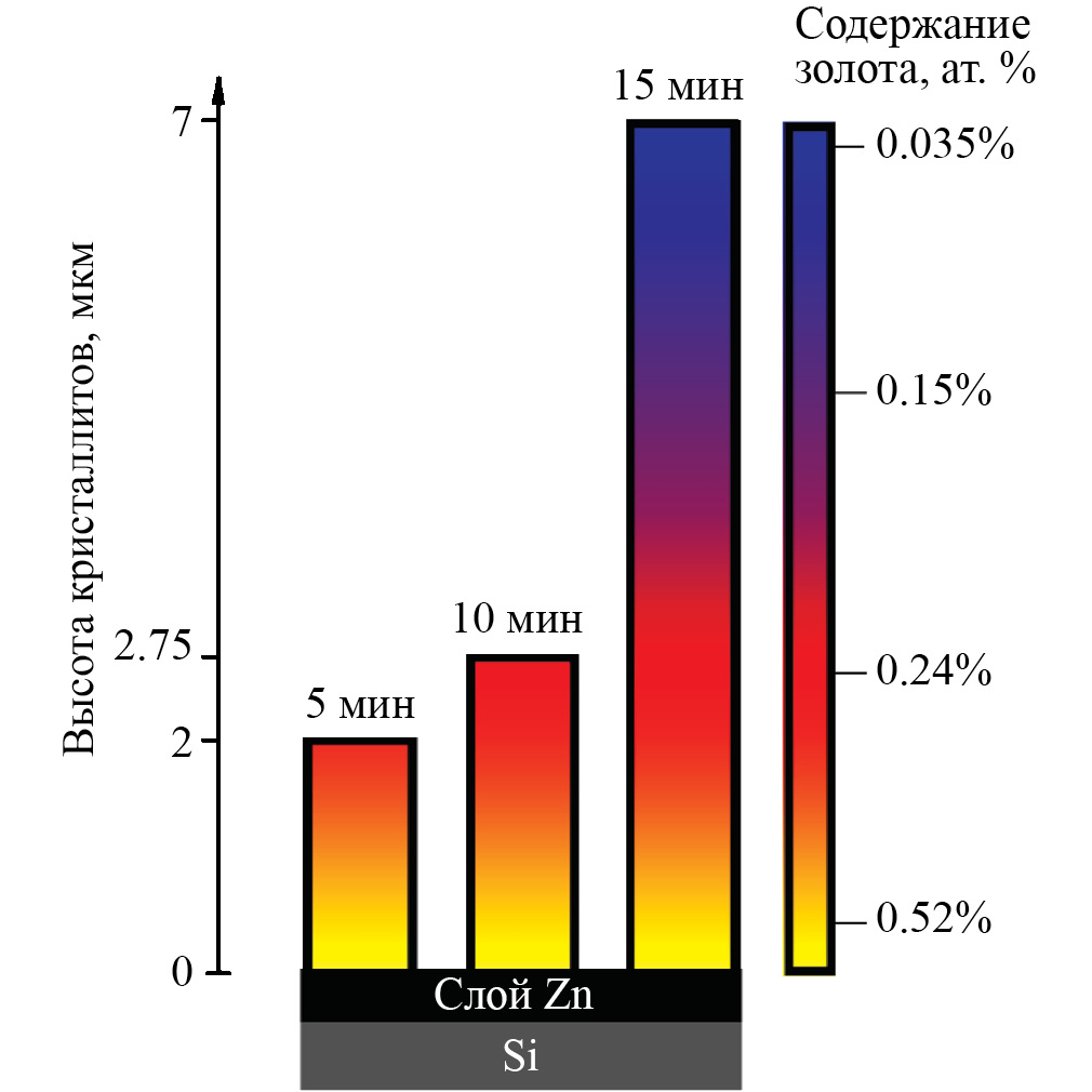 Легирование может осуществляться как добавлением примесного компонента к исходному материалу или реагенту [24–26], так и нанесением на поверхность подложки тонкого слоя металла-катализатора с последующим ростом нанокристаллитов [27, 28]. При легировании металлами, имеющими температуру плавления, близкую к температуре процесса роста оксида цинка, при нагреве может происходить нарушение предварительно сформированного сплошного металлического слоя, что оказывает существенное влияние на морфологию выращиваемых нанокристаллитов ZnO. При этом даже в случае металлов, имеющих температуру плавления значительно выше ZnO, нарушение предварительно сформированного слоя также может наблюдаться при использовании крайне тонких слоев металла-катализатора [28]. Легирование путем предварительного нанесения слоя металла-катализатора может приводить к неравномерному распределению примесной компоненты по объему кристаллитов и, как следствие, к локальным различиям как структуры, так и свойств микрокристаллов. В связи с этим настоящая работа посвящена изучению динамики процесса легирования благородными металлами полупроводниковых микрокристаллов ZnO с помощью предварительного нанесения тонкого слоя металла-катализатора, в данном случае золота.