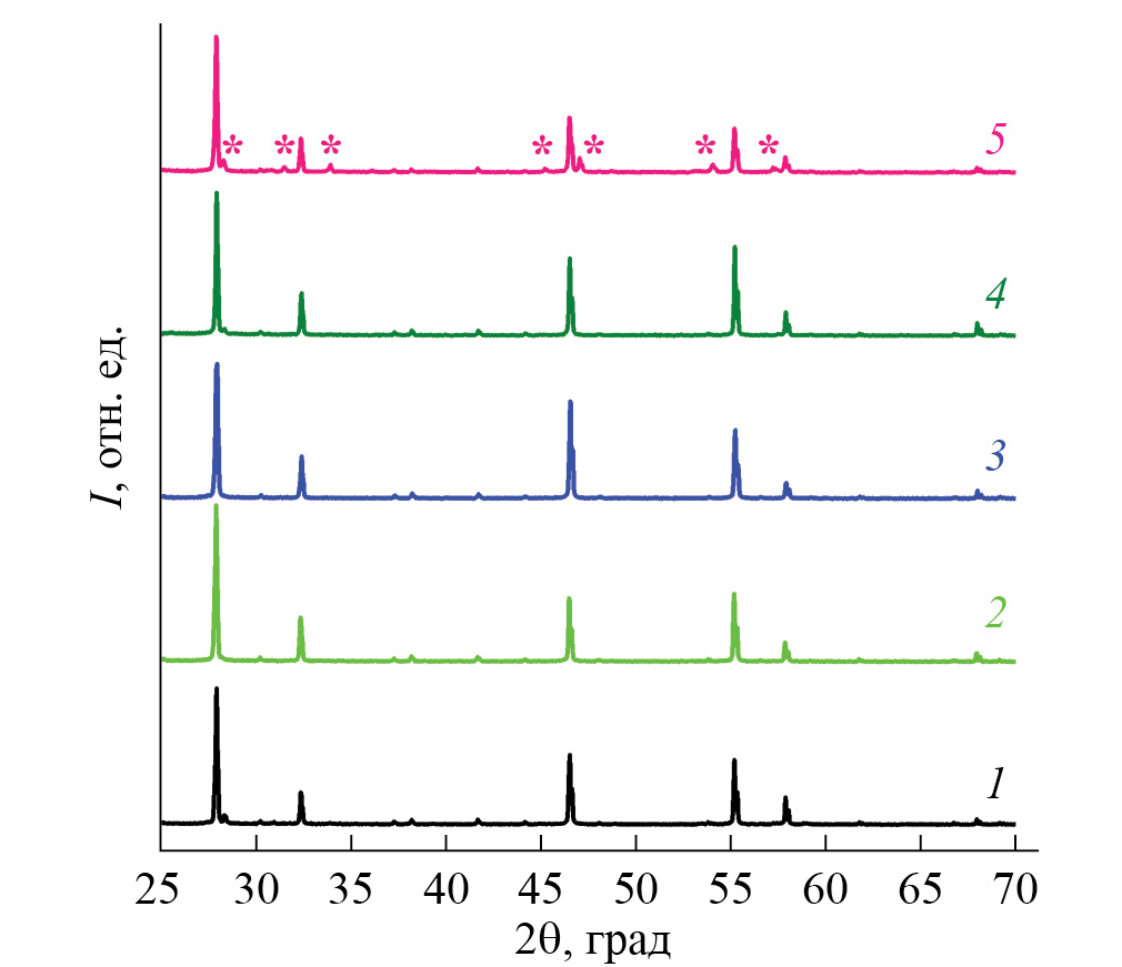 На рис. 2 представлены порошковые дифрактограммы, полученные для монокристаллов номинального состава LiyNd5 – yMo3O16 ± δ и керамик LixNd5 – xMo3O16 ± δ (x = 0, 0.05, 0.15, 0.25). Поликристаллические образцы с x = 0 и 0.05 (рис. 2, кривые 2, 3) изоструктурны. При х = 0.15 (рис. 2, кривая 4) появляется пик второй фазы (θ = 28.47°), интенсивность которого возрастает с увеличением количества лития в образце (рис. 2, кривая 5). Плотность, измеренная гидростатическим взвешиванием в толуоле, составила в среднем 95% от теоретической (рентгеновской) плотности для всех синтезированных керамик.