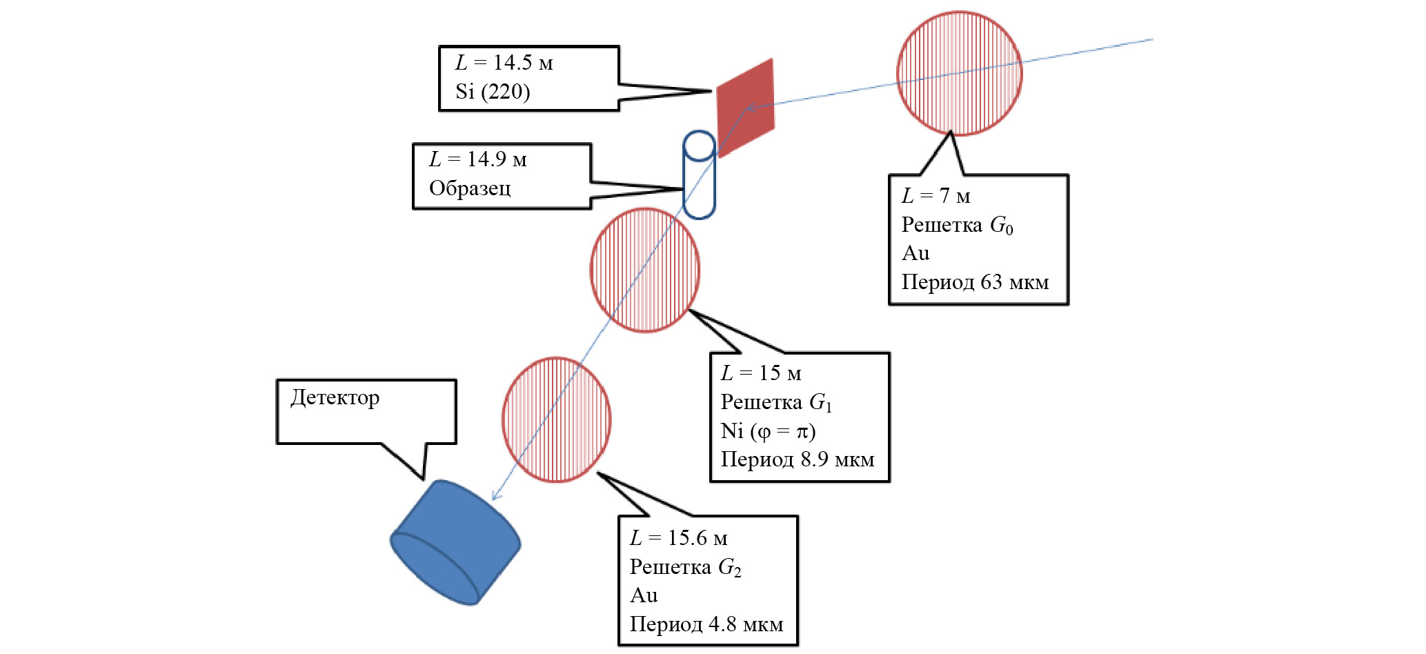 Радиографические исследования методом фазовоконтрастной визуализации проводили на станции “Медиана” Курчатовского источника СИ при энергии фотонов E = 25 кэВ. Для достижения условий фазового контраста использовали интерферометр Тальбота–Лау [6] с тремя решетками: решеткой-источником G0 (период 63 мкм, толщина слоя Au 54 мкм), фазовой решеткой G1 (период 8.92 мкм, толщина Ni 8.8 мкм, что соответствует сдвигу фазы на ð) и амплитудной решеткой G2 (период 4.8 мкм, толщина Au 50 мкм). Детектор на основе сцинтиллятора и КМОП-матрицы имел поле зрения 20 × 20 мм и размер пикселя 5 мкм. На рис. 1 представлена схема проведения эксперимента.