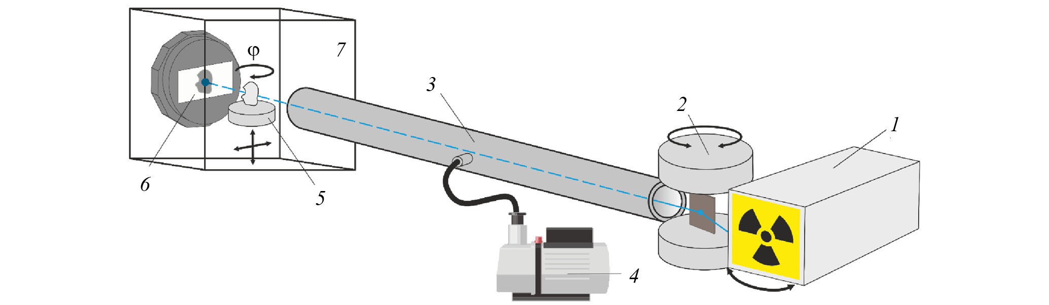 Рис. 2. Схема рентгеновского микротомографа: 1 – источник рентгеновского излучения (рентгеновская трубка), 2 – блок монохроматора, 3 – вакуумный путь (коллиматор), 4 – вакуумный насос, 5 – изучаемый образец и система позиционирования, 6 – рентгеновский детектор XIMEA xiRAY11, 7 – зона локальной радиационной защиты