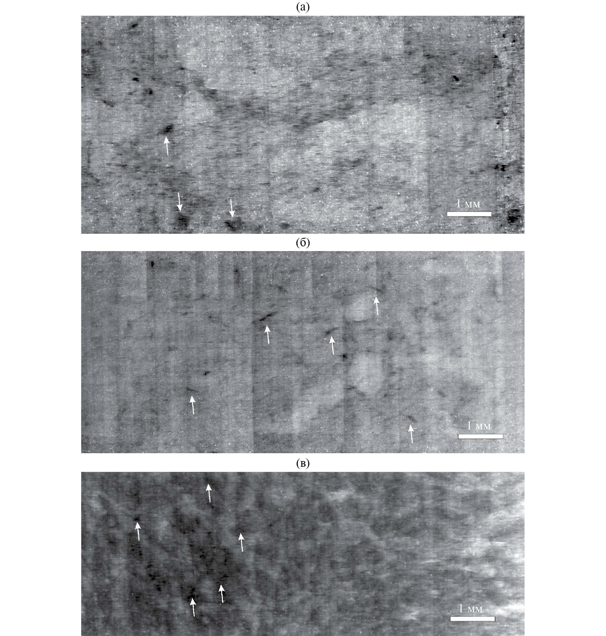 Рис. 3. Рентгенографические снимки модельных образцов (а, б) и хрящевой ткани (в), полученные с помощью СИ при энергии фотонов Е = 25 кэВ (стрелками указаны агломераты частиц)