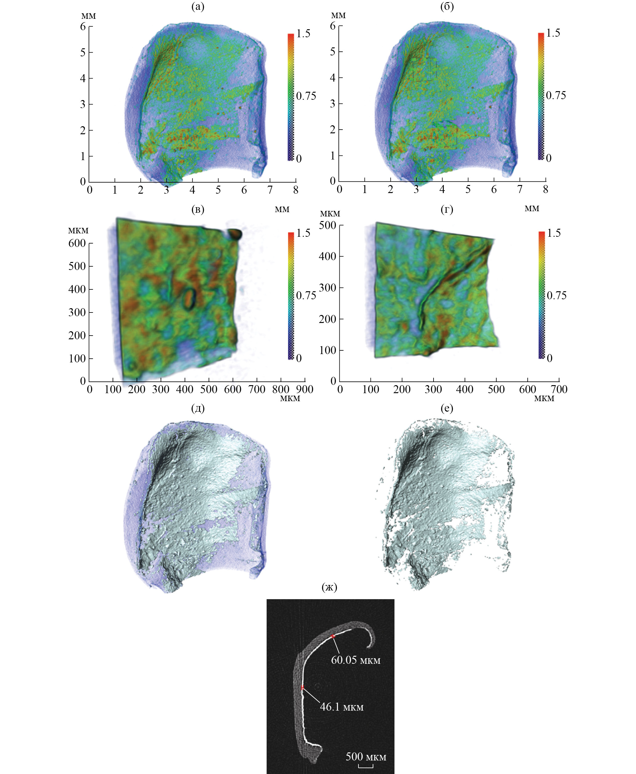 Рис. 5. Результаты трехмерной реконструкции образца суставного хряща, выделенного из эпифиза берцовой кости коровы, с наночастицами Na0.2TiO2: а – весь образец, б – выделены участки для увеличенного изображения, в, г – томография выделенного на рис. б нижнего и верхнего фрагмента соответственно, д, е – после процедуры сегментации весь объем и поверхностный слой, ж – боковая томографическая проекция (визуализация нанесенного слоя)