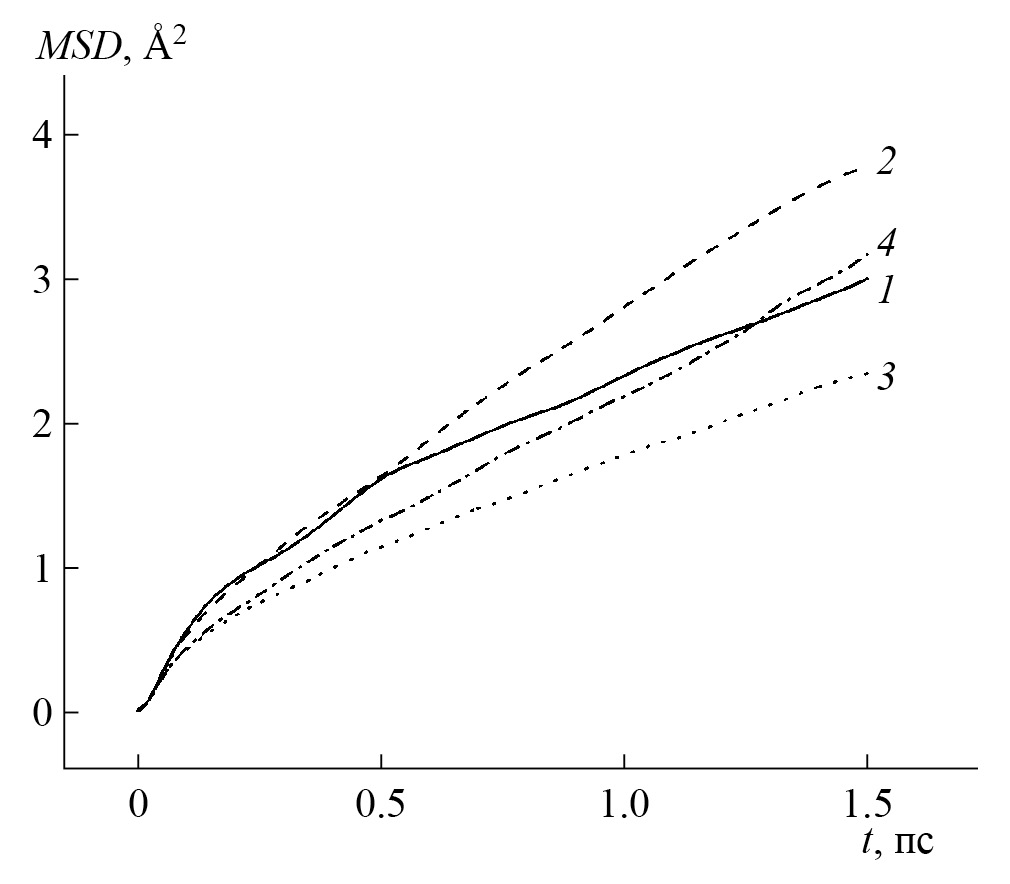 Поскольку моделируемая ячейка имеет сравнительно небольшие размеры, был проведен анализ локальной диффузии атомов фтора вблизи атомов металлов, т.е. в окрестности первой координационной сферы. Оказалось, что в процессе моделирования равновесие в системе достигается в течение ~1 пс, о чем свидетельствуют временные данные СКС, представленные на рис. 3. Действительно, на графике зависимости СКС от времени угол наклона апроксимирующей прямой практически не изменяется с увеличением времени, что соответствует установившемуся равновесному состоянию исследуемой системы.
