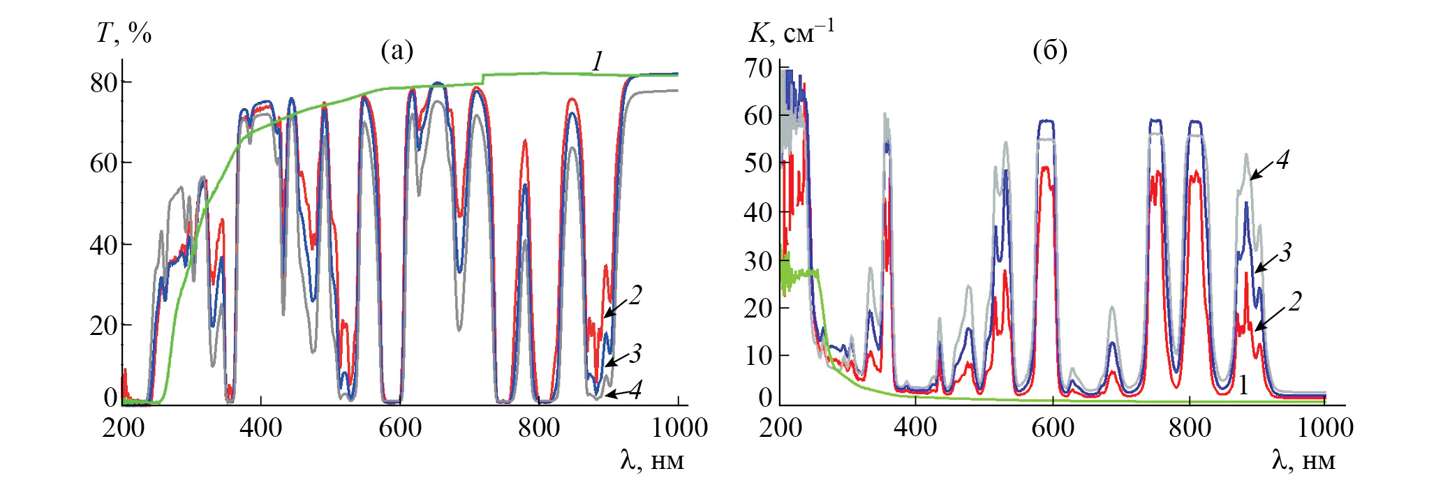 Для оптических исследований из кристаллов изготавливали полированные пластинки, перпендикулярные оптической оси <0001>, толщиной 1.76 мм (LGS), 1.04 мм (LN0.4GS), 0.83 мм (LN0.6GS) и 0.81 мм (NGS). Спектры пропускания исследуемых кристаллов (рис. 1а) в диапазоне 200–1000 нм измеряли на спектрофотометре Cary-5000 с универсальной измерительной приставкой UMA [16]. Спектры поглощения K без учета отражения (рис. 1б) можно рассчитать из спектров пропускания по формуле [17]:
