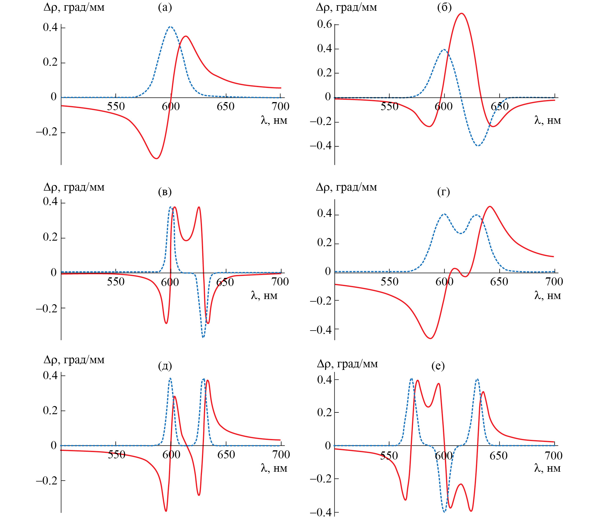 Вид величины Δρi для одной полосы циркулярного дихроизма θi представлен на рис. 5а. Для нескольких полос величина Δρ рассчитывается как сумма вкладов каждой отдельной полосы. Для двух полос одной величины, но разных знаков добавка Δρi показана на рис. 5б, 5в, для двух полос одного знака – на рис. 5г, 5д, для трех полос разных знаков – на рис. 5е. Аналогичным образом можно провести расчет для любого числа полос разных величин и знаков. Полная величина ρ рассчитывается прибавлением добавки Δρ к дисперсионной зависимости, полученной без учета рассматриваемых полос поглощения (рис. 4).