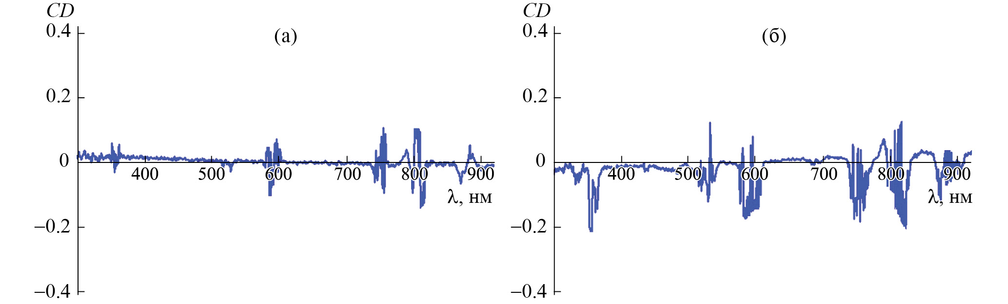 Для получения циркулярного дихроизма измерены спектры пропускания и поглощения при правой и левой круговой поляризации падающего света. Измерения проводили с помощью стандартного CCD-спектрометра, определяющего спектры пропускания; для получения круговой поляризации использовали линейный поляризатор и пластинку λ/4.
