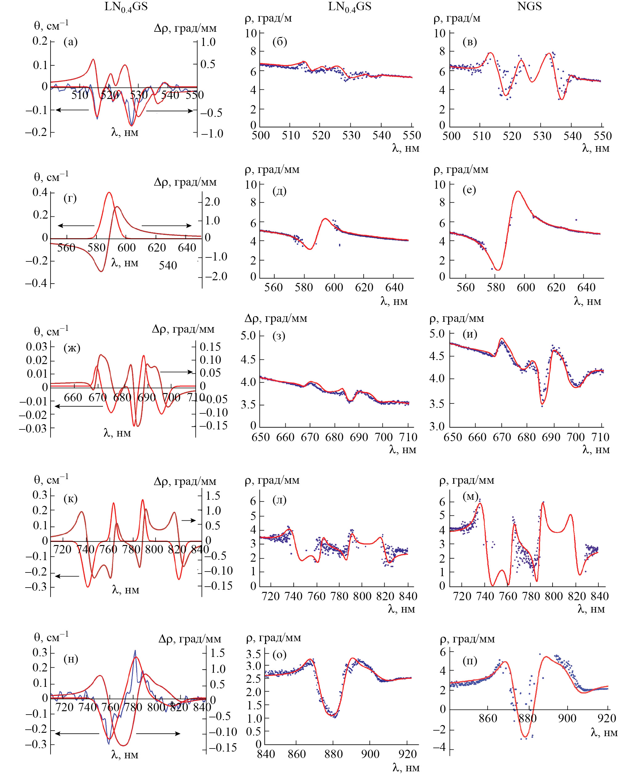 Для определения связи оптической активности и циркулярного дихроизма рассмотрим некоторые полосы поглощения, наблюдаемые для кристаллов (La1 – хNdх)3Ga5SiO14. Рассмотрим для примера пять диапазонов длин волн: 500–550, 550–650, 650–710, 710–840 и 840–920 нм. Для расчета вклада циркулярного дихроизма в величину ρ проводилась экстраполяция экспериментальной величины θ экспоненциальными функциями (9). С использованием полученных функций проводился расчет ∆ρ по формуле (10). Для расчета ρ к дисперсионной зависимости, рассчитанной без учета поглощения, прибавляли ∆ρ. Полученные значения θ, ∆ρ и ρ, а также сравнение рассчитанных величин ρ с экспериментальными показаны на рис. 7 на примере кристаллов LN0.4GS и NGS. Экспериментальная дисперсия ρ вблизи полос поглощения рассчитана из измеренных спектров пропускания по формулам (6) для τ = ±45º. Самый простой случай – одна полоса циркулярного дихроизма – имеет место в диапазоне 550–650 нм (рис. 7г–7е). В остальных диапазонах рассматривалось несколько полос циркулярного дихроизма (рис. 7).