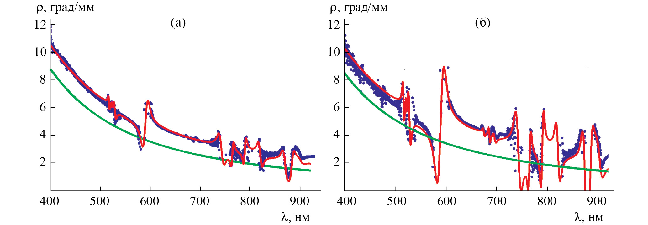 На примере измерения спектров пропускания кристаллов LGS (рис. 2б) и расчета величины ρ по формулам (4)–(6) показано, что для тонких образцов лучшие результаты получаются при использовании спектров пропускания при –45º и 45º, –30º и 30º. Такой вывод был сделан исходя из сравнения полученных значений ρ для LGS с известными экспериментальными данными [10]. При расчетах из спектров, измеренных при параллельных и скрещенных поляризаторах, получаются заметно завышенные результаты, поэтому использовать их для тонких образцов нецелесообразно. Наиболее близкие к экспериментальным величины ρ получаются при усреднении данных, рассчитанных из спектров пропускания при τ = ±30º и ±45º. Именно так проведен расчет ρ для кристаллов лангасита с разным содержанием Nd.
