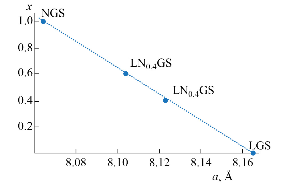 Результаты измерений подтвердили пр. гр. P321, Z = 1 и установили при 295 К параметры элементарной ячейки a и c, равные 8.1652(6) и 5.0958(5) Å для LGS [5, 28, 29], 8.123(1) и 5.078(1) Å для LN0.4GS, 8.10403(3) и 5.07565(6) Å для LN0.6GS, 8.06449(3) и 5.06143(2) Å для NGS [30, 31] (даны наиболее точные известные результаты).