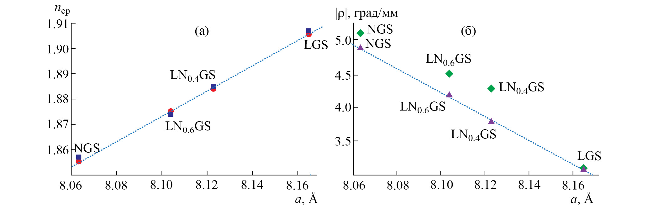 Результаты расчетов приведены в табл. 1. Видно, что показатели преломления в ряду LGS, LN0.4GS, LN0.6GS, NGS уменьшаются, а значения ρ увеличиваются. При этом зависимость nср от параметров ячейки можно аппроксимировать прямой линией (рис. 11а). Также линейная зависимость от параметров ячейки получается для величин ρ, рассчитанных по программе WinOptAct (рис. 11б). Отметим, что для экспериментальных значений ρ линейной зависимости от параметров ячейки не наблюдается, что, вероятно, связано с влиянием поглощения на оптическую активность и нелинейной зависимостью геометрических характеристик спиралей электронной плотности от содержания неодима.