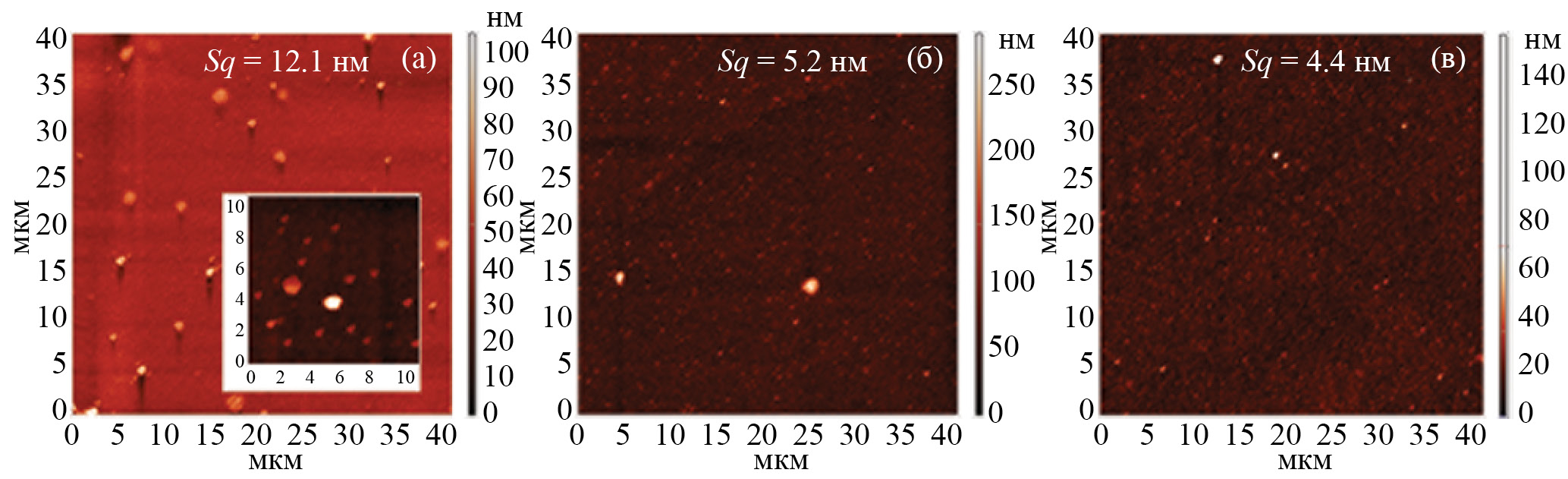 Рис. 4. АСМ-изображения тонкой пленки CdTe, выращенной на подложке Si (111): а, б, в – области 1, 2, 3 соответственно. На врезке – увеличенный вид области 1