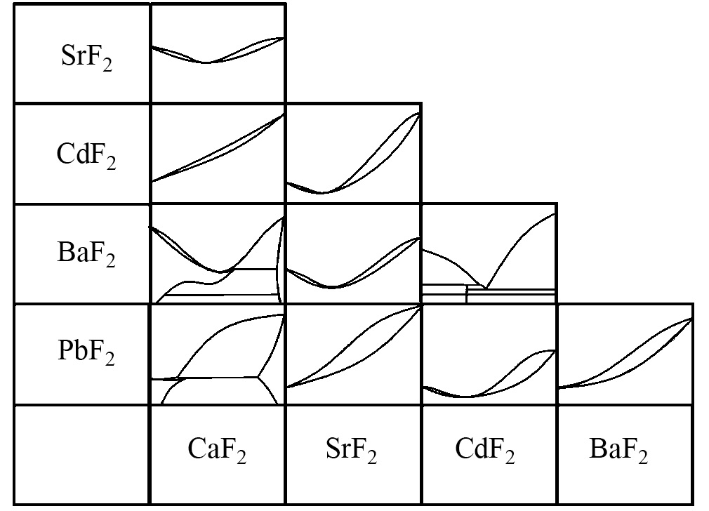 Вопросы существования стационарных точек в двойных и многокомпонентных системах детально проработаны для равновесия жидкость–пар, так как этого требовали процессы дистилляции и ректификации [28, 29]. Термодинамико-топологический подход позволяет провести полную аналогию между равновесиями жидкость–пар и жидкость–твердое для твердых растворов [27, 30–32]. В системах MF2–M'F2 (M ≠ M' = Ca, Sr, Cd, Ba, Pb) при изоморфном замещении образуются твердые растворы M1–xM'xF2 флюоритовой структуры. Они удовлетворительно описываются моделью регулярных растворов. При условии, что теплота смешения компонентов в твердой фазе больше, чем в жидкой, эта модель дает общее решение в виде стационарной точки минимума на линиях ликвидуса и солидуса (аналога положительного азеотропа для равновесия жидкость–пар). Из схемы на рис. 1 можно видеть, что точка температурного минимума реализуется в четырех таких системах, а именно СаF2–SrF2, BaF2–SrF2, СdF2–SrF2 и PbF2–СdF2. Образуемые ими две тройные системы PbF2–CdF2–SrF2 и CdF2–SrF2–CaF2 интересны тем, что состоят из сплошного поля флюоритового твердого раствора. Флюоритовый твердый раствор в системе PbF2–CdF2–SrF2 был исследован в [33]. К сожалению, тройной минимум в этой системе не реализуется. Перспективной с точки зрения однородности выращиваемых монокристаллов можно считать область твердых растворов в системе BaF2–SrF2–CaF2, хотя она ограничена [34].