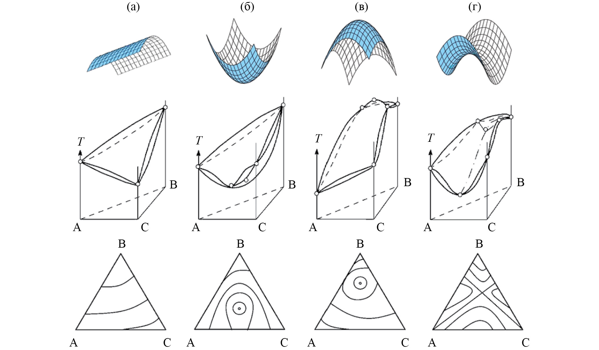 Твердые растворы с тремя типами стационарных точек схематически показаны на рис. 2. Все виды кристаллизационных поверхностей в трехкомпонентных системах рассмотрены в [27].