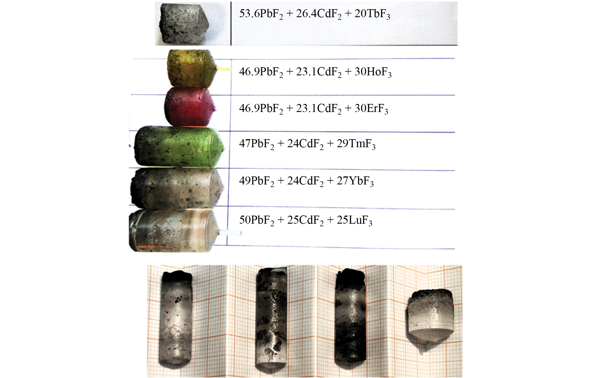 Работа с фторидами свинца и кадмия затруднена из-за их токсичности, высокой летучести и меньшей химической стойкости по сравнению с другими дифторидами. Даже из-за небольших потерь PbF2 и CdF2 в процессе кристаллизации может происходить сдвиг состава кристалла в сторону RF3. Для выращивания кристаллов нелетучих неорганических фторидов с близкими температурами плавления допустимо использовать многоячеистый тигель. В данном случае температуры плавления конгруэнтных составов с R = Tb, Ho, Er, Tm, Yb и Lu находятся в диапазоне ~830–1000°C. Поэтому было выполнено несколько ростовых экспериментов с разными группами составов. Из-за трудоемкости эксперимента не использовали индивидуальные тигли и индивидуальные условия кристаллизации для каждого состава. Чтобы минимизировать потери и предотвратить изменение состава кристаллизацию осуществляли под избыточным давлением инертного газа 45–50 кПа. В результате нескольких серий экспериментов выращены кристаллические були диаметром 5 и 10 мм и длиной от 15 до 50 мм, примеры которых приведены на рис. 4. Из них были вырезаны продольные и поперечные пластины и отполированы для оптического просмотра.