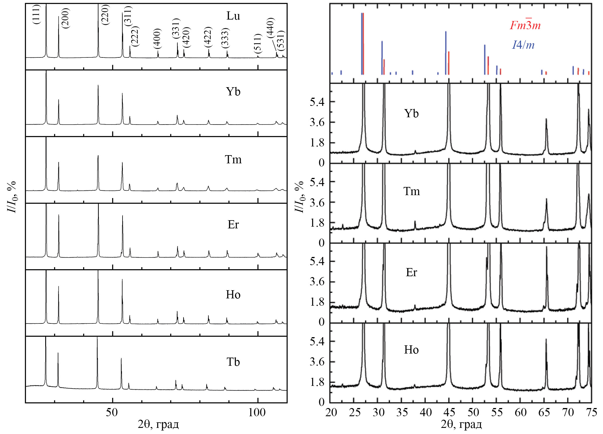 Образцы, вырезанные из средних частей кристаллов, исследовали с помощью РФА, дифрактограммы приведены на рис. 6а. Основной фазой во всех образцах является кубическая, проиндицированная в пр. гр. Fm3m. В образцах с R = Ho, Er, Tm, Yb фиксируются следы примесной фазы, которая, по всей вероятности, образуется в результате частичного распада твердого раствора при охлаждении. При гетеровалентном изоморфном замещении М2+ на R3+ увеличивается концентрация структурных дефектов, которые при низких температурах формируют упорядоченные фазы. Примесная фаза изоструктурна соединению Pb2YF7 (пр. гр. I4/m) [55], в котором позиции Y занимают соответствующие катионы R, а позиции Pb могут быть частично замещены катионами Cd. При этом оптическая микроскопия не выявила никаких ограниченных включений. На рис. 6б детально показаны диффрактограммы неоднофазных образцов. Основные рефлексы фаз I4/m и Fm3m накладываются. Низкотемпературные превращения делают найденные конгруэнтные составы бесполезными для оптических приложений. Кристаллы с R = Tb и Lu не имеют следов распада. Они также являются неравновесными при комнатной температуре, но могут быть стабильными очень продолжительное время. Эти кристаллы могут представлять интерес в качестве матриц для легирования активными ионами РЗЭ.