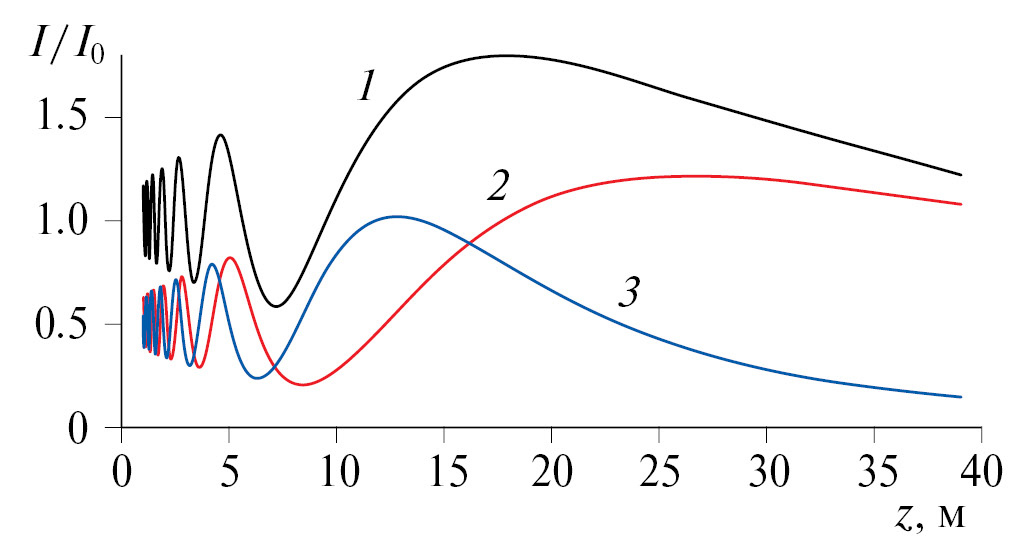 Рис. 2. Относительная интенсивность пучка СИ в центре щели в зависимости от расстояния до детектора (1) и вклады в нее от косинуса (2) и синуса (3) для d = 50 мкм и энергии фотонов 25 кэВ.