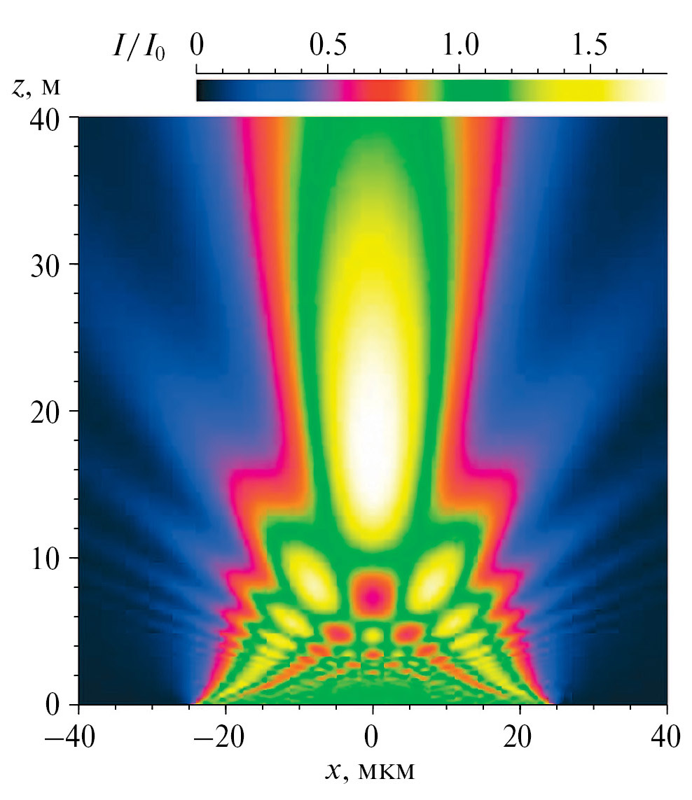 Область ближнего поля, где пучок слабо меняется согласно геометрической оптике, имеет относительно малые размеры. В области дифракции Френеля имеет место сильная интерференция, источником которой являются края щели, где происходит резкая смена режимов однородности пространства. Наиболее интересным является эффект сжатия пучка с увеличением интенсивности при z = zm. При этом щель работает как слабо фокусирующий оптический прибор. Компьютерный расчет, представленный на рис. 3–5, выполнен по программе XRWP. Все детали расчета можно найти на сайте программы [16], включая теоретические формулы и примеры решения различных задач. Для расчета использовали сетку точек с шагом 0.1 мкм и числом 215 = 32768. Рисунок 3 выполнен по матрице с числом точек 401 × 401, а время расчета составило несколько секунд.