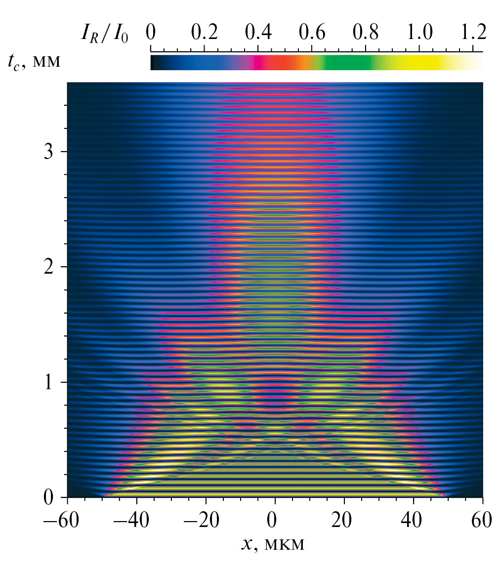 На рис. 4 представлено аналогичное распределение интенсивности, но для случая, когда сразу после щели пучок СИ попадает в монокристалл кремния, установленный в точном брэгговском положении для отражения 220. Поэтому вместо расстояния z по вертикальной оси показана толщина кристалла tc. Параметры дифракции вычисляли с помощью онлайн-программы [24]. При этом θB = 7.42°, Re(χ) = 9.34 × 10–7, Λс = 52.7 мкм. Из-за эффекта экстинкции картинка получается полосатой. Однако если следить за распределением интенсивности в максимумах экстинкционных биений, то можно заметить некоторую аналогию с дифракцией на щели в воздухе, показанной на рис. 3. Рисунок выполнен на матрице с числом точек 801 × 801. Время расчета соответственно увеличилось до некольких минут.