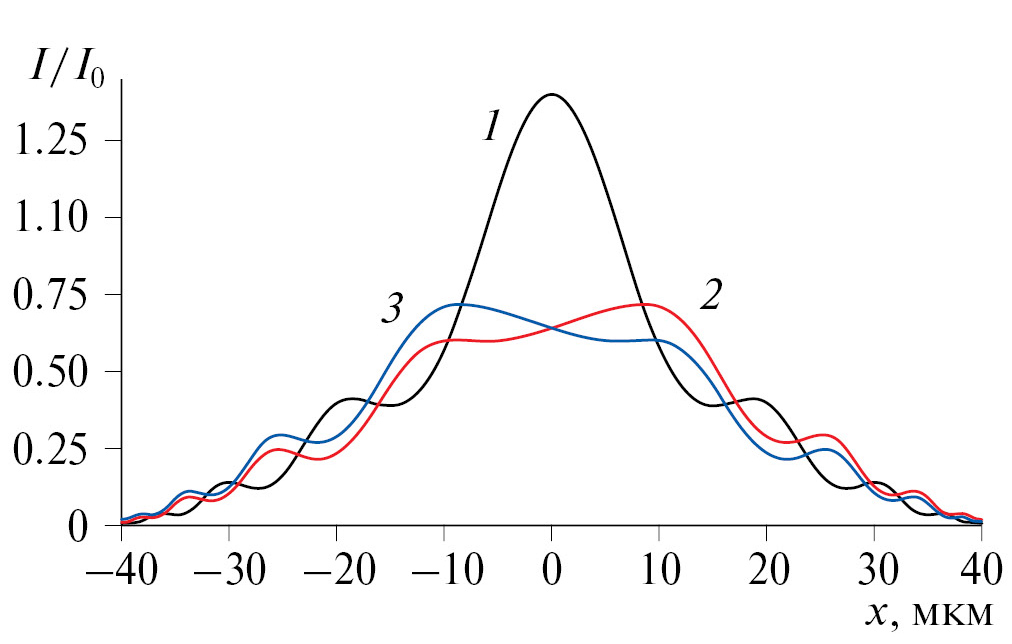 До сих пор предполагалось, что кристалл выставлен в точном угловом положении для дифракции на кристаллической решетке. Естественно, возникает вопрос о том, с какой точностью это угловое положение должно быть выставлено для того, чтобы обсуждаемое соответствие не нарушалось. Получить аналитический ответ на этот вопрос пока не удалось, но численное моделирование способно дать ответ. На рис. 6 показаны три кривые для энергии фотонов 25 кэВ кристалла кремния толщиной 500 мкм и (220) отражения. Кривая 1 соответствует рис. 4 для указанной толщины, кривые 2, 3 получены при повороте кристалла на угол 5 × 10–7 рад относительно точного угла, удовлетворяющего условию Брэгга, в разные стороны. Кривые становятся асимметричными и зеркально отражаются при смене знака угла поворота.