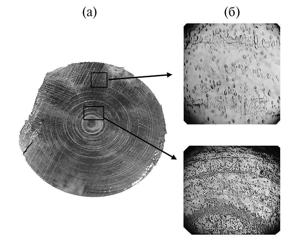 От конечной части слитка с дефектами отрезали шайбу толщиной 20 мм, из центральной части которой параллельно оси роста вырезали пластину толщиной 2 мм. Шайбы для определения плотности дислокаций и пластины, вырезанные параллельно оси роста, механически шлифовали, а затем химически полировали в травителе состава НF:HNO3:H2O = 1:3:2 до получения зеркально гладкой поверхности. Для выявления дислокационных ямок травления использовали травитель состава Н3РО4:HBr = 2:1 при кипении.