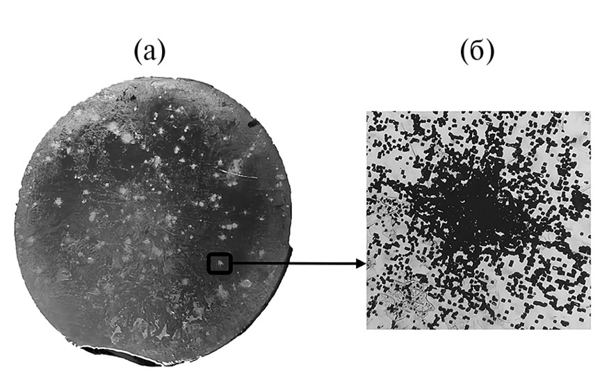 На поперечных шайбах, вырезанных из концевой части кристалла при полировке, выявляется “звездное небо”. Картина “звездного неба” представлена на рис. 2а, на которой наблюдаются белые ямки, выявляемые после полировки. После дислокационного травления внутри белых ямок выявляются “дислокационные розетки”, образующиеся вокруг включений In. Они представляют собой четырехугольные звезды, соответствующие симметрии плоскости (100). Такие “дислокационные розетки” образуются вокруг включений элементов III группы таблицы Менделеева в соединениях АIIIBV. Они возникают из-за напряжений, которые появляются вокруг включений элемента III группы при охлаждении кристалла.