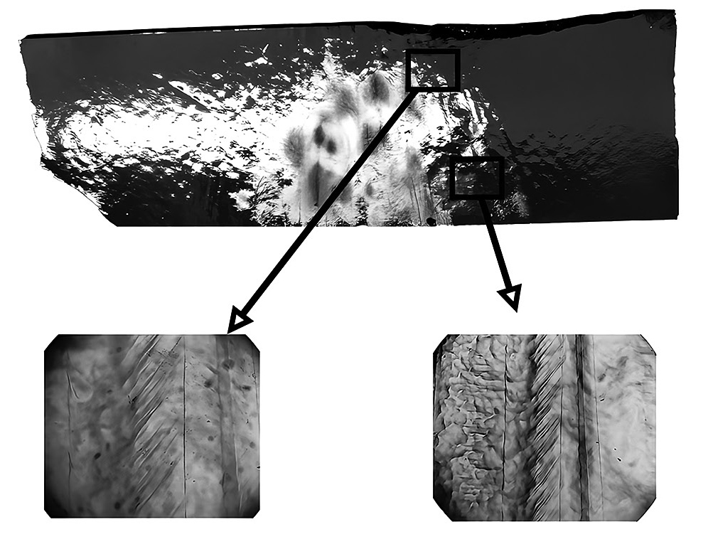 Рис. 3. Область с включениями индия, выявленная полировкой, в нижней части кристалла диаметром 50 мм.