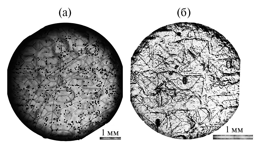 Отполированные пластины травили в проекционном травителе Абрахамса–Бьюоччи (А/В-травитель) [3]. Травление осуществляли в “пьяной бочке” в течение 30 мин. “Пьяная бочка” – это сосуд, изготовленный из фторопласта, расположенный под углом к поверхности (чаще всего 30°–45°), который вращается со скоростью ~30 об./мин. При этом раствор постоянно омывает образец. В процессе проекционного травления выявляются следы, соответствующие проекции дефектов, находящихся в стравленном слое [4].