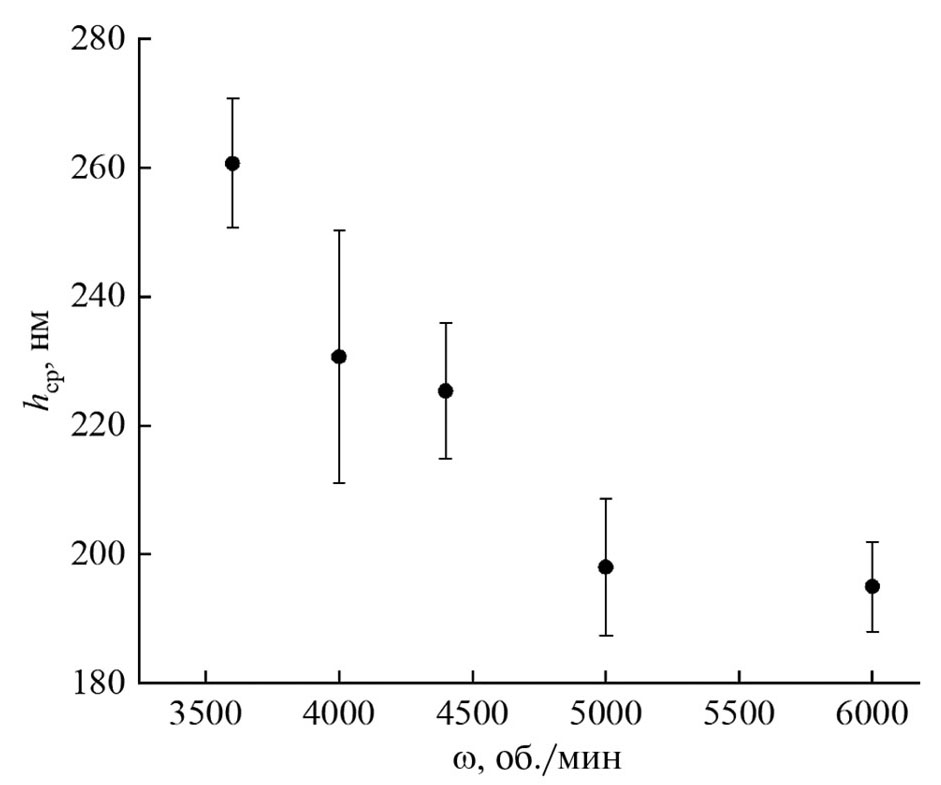 Рис. 1. Зависимость средней толщины пленок MAPbBr3, полученных при оптимальных временах внесения антирастворителя, от скорости вращения стеклянной подложки.