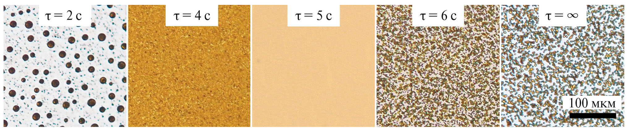 Рис. 2. Оптические изображения пленок MAPbBr3, приготовленных при скорости вращения центрифуги 4400 об./мин, температуре 22°С и различном времени внесения антирастворителя τ = 2, 4, 5, 6 с и ∞ (антирастворитель не добавлялся).