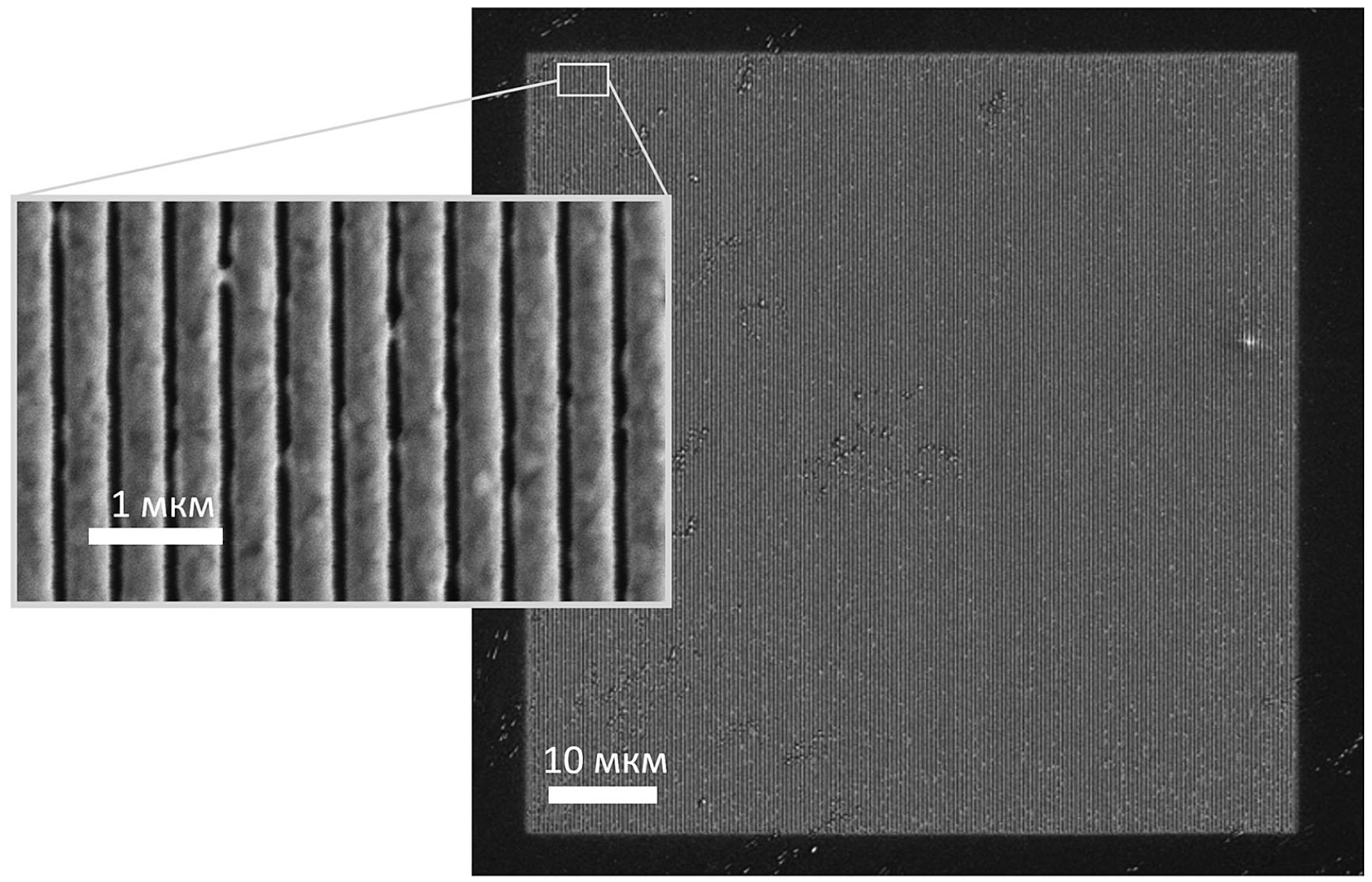 Субволновые перовскитные решетки большей площади и их оптические свойства. Структуры большего размера в виде квадратов со стороной 80 мкм (рис. 6), подходящие для оптической диагностики, были созданы с использованием цифровых шаблонов травления сфокусированным ионным пучком массивов параллельных полос при оптимальных параметрах работы двулучевого РЭМ. Результаты оптической диагностики необработанной части образца и решетки приведены на рис. 7. Для сравнения на рисунке также представлены результаты численного моделирования в COMSOL Multiphysics спектров пропускания света в предположении идеального совершенства слоев и профиля щелей в них. Оптические свойства всех материалов были взяты из литературных данных: показатель преломления света в ПММА – из [11], показатель преломления и поглощения света в MAPbBr3 и ITO – из [12, 13], показатель преломления дисплейного стекла – из [14].