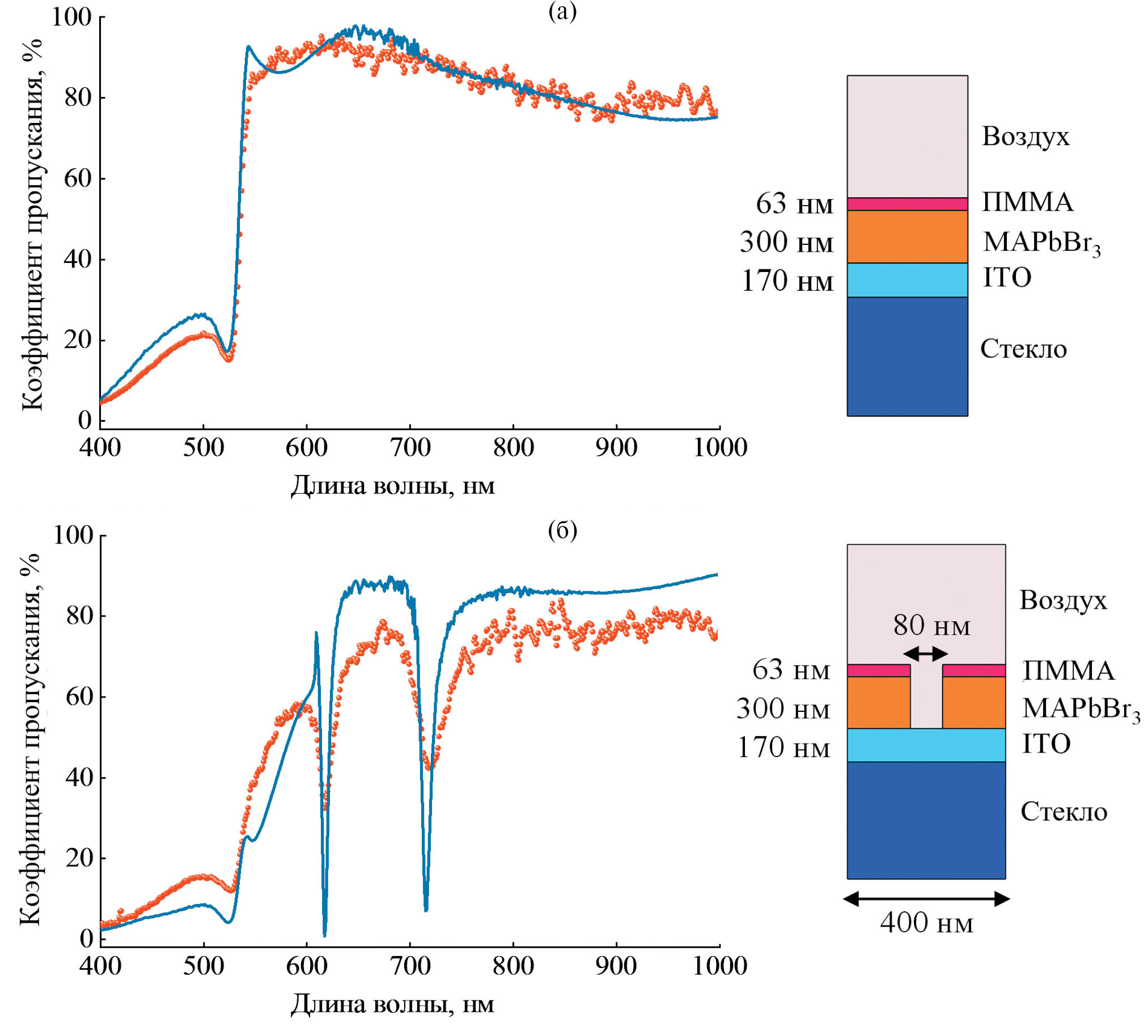 Рис. 7. Оптические свойства пленки MAPbBr3 (а) и субволновой решетки, созданной сфокусированным ионным пучком путем травления в ней параллельных щелей с периодом 400 нм (б): смоделированные (сплошные линии) и измеренные (точки) спектры пропускания света, линейно поляризованного поперек щелей. Справа приведены схемы плоской пленки и элементарной ячейки субволновой решетки соответственно.