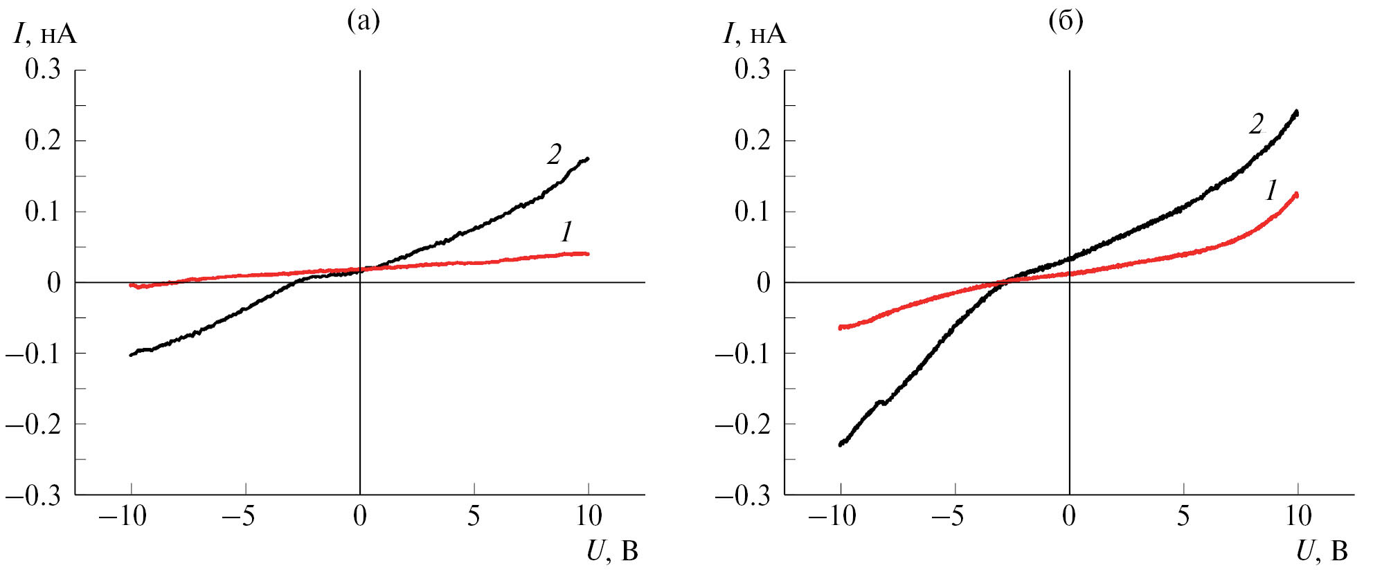 Локальная проводимость кристаллов. Для изучения зависимости электропроводности от состава и ориентации образцов были измерены локальные ВАХ перпендикулярно и параллельно оси а при 296 К. Графики зависимостей I(U) контакта зонд–образец для составов Cs3(HSO4)2(H2PO4) (рис. 2а) и Cs4(HSO4)3(H2PO4) (рис. 2б) были получены при статичном положении зонда при подаче напряжения смещения от –10 до +10 В. Для повышения достоверности информации ВАХ усредняли по 25 кривым.