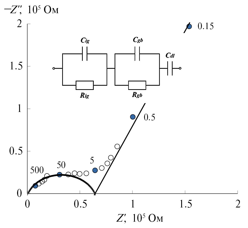 Из годографа импеданса при комнатной температуре (рис. 1) удается определить только общее сопротивление Rcer = Rig + Rgb, поскольку величина Rcer определяется в основном значением межзеренного сопротивления Rgb (выполняется условие Rig << Rcer). Удельную электропроводность керамических образцов с учетом геометрических размеров находили по формуле