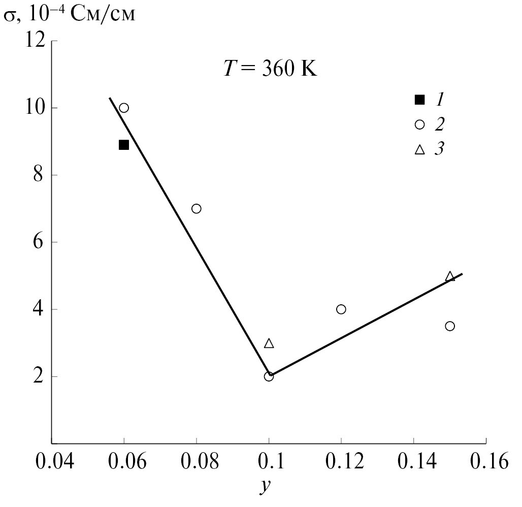 Рис. 2. Концентрационная зависимость внутризеренной проводимости поликристаллов Bi1–yBayF3–y: 1 – данные проведенного исследования, 2 – данные [7, 18], 3 – данные [19].