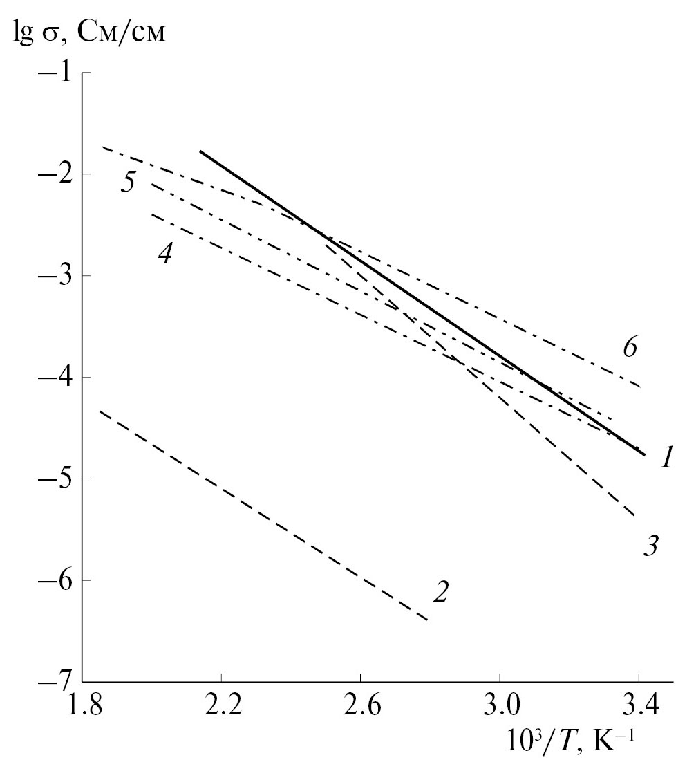 Рис. 4. Температурные зависимости анионной проводимости фторидных материалов в координатах lgσ, 103/T: 1 – керамика Bi0.94Ba0.06F2.94 (нагрев), 2 – поликристалл BiF3 [3], 3 – поликристалл Bi1–yKyF3–2y [20], 4 – поликристалл Bi1–yPbyF3–y [25], 5 – керамика La0.95Ba0.05F2.95 [26, 27], 6 – монокристалл La0.95Ba0.05F2.95 [28].