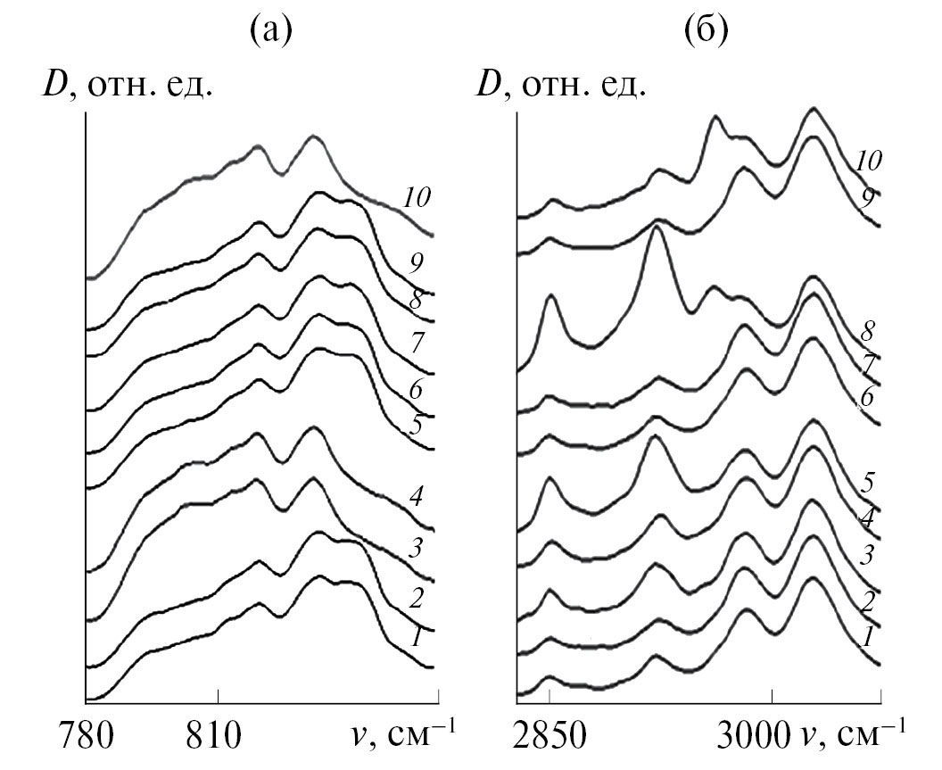 Полоса поглощения при 2962 см–1 проявилась в ИК-спектрах ТСПЛ после обработки при 170°С в течение 20 и 150 мин. Она также отвечает за валентные колебания связей С–Н (рис. 4б, кривые 8, 10). Однако конформация последовательностей звеньев ВФ, ответственная за нее, в настоящее время не понятна.