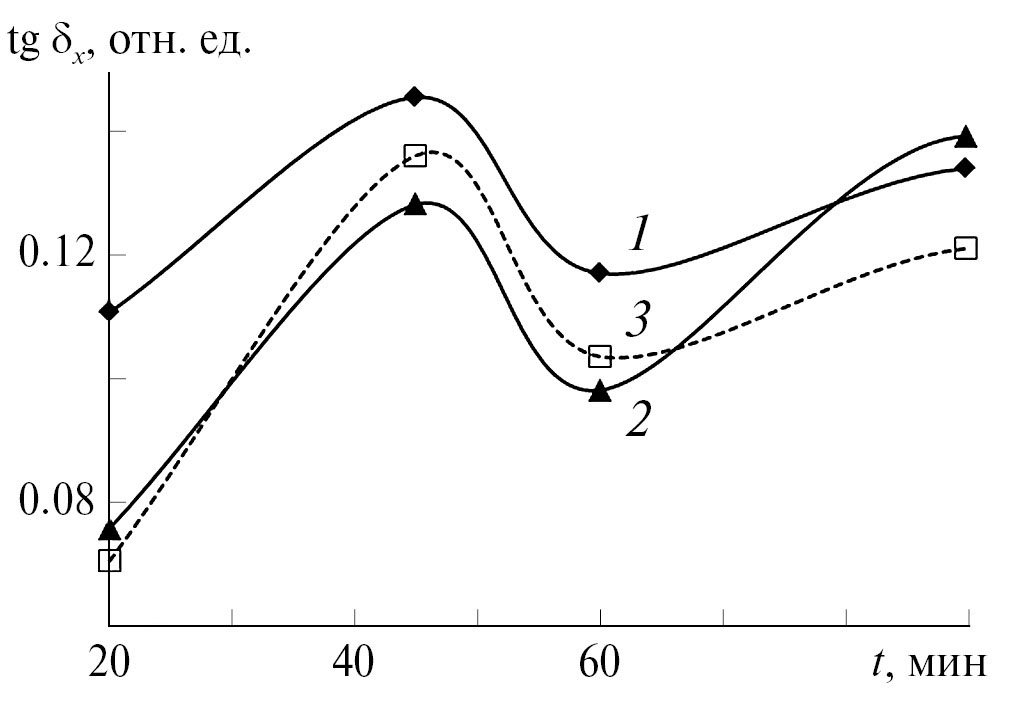 Рис. 5. Зависимость от времени термообработки ТСПЛ при 75°С коэффициента диэлектрических потерь при частотах переменного тока: 18 (1), 19 (2), 20 МГц (3).