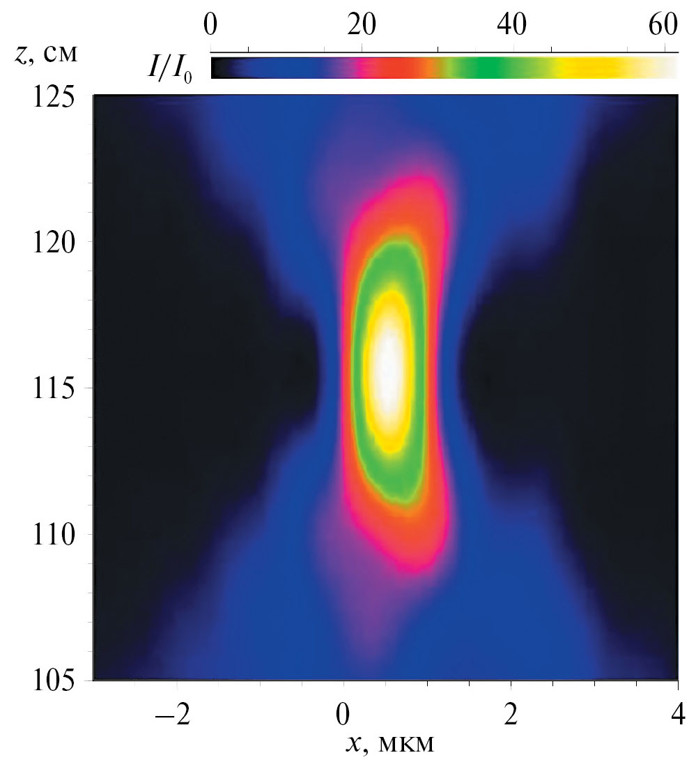 На рис. 2 представлен случай, когда z0 = z1. Соответственно, z1 = 2Fs, и фокусировка происходит при расстоянии примерно 224 см. Рисунок показывает двумерное распределение интенсивности в плоскости (x, z), координата z изменяется в диапазоне, соответствующем глубине фокуса линзы. Нормировка интенсивности выполнена с учетом закона сохранения энергии, т. е. интенсивность в фокусе относится к интенсивности перед РДЛ. При этом перед РДЛ относительная интенсивность равна единице. Интегральная интенсивность, попадающая в фокус, соответственно равна апертуре РДЛ. Если РДЛ не поглощает, вся интенсивность в фокусе сжимается в пик, интеграл от которого примерно равен произведению ширины пучка на половине высоты на максимум интенсивности. Грубо говоря, во сколько раз сжимается пучок, во столько же раз увеличивается его максимальная интенсивность. Если этого не происходит, значит, есть потери интенсивности.