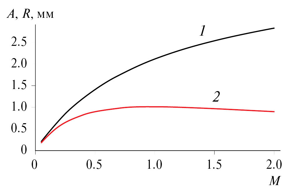 Рис. 4. Зависимость оптимальных значений апертуры A (1) и радиуса кривизны поверхности R (2) линзы от параметра M = z1/z0 при фиксированном расстоянии zt = z0 + z1 = 4.48 м. Все остальные параметры те же, что и на рис. 2.