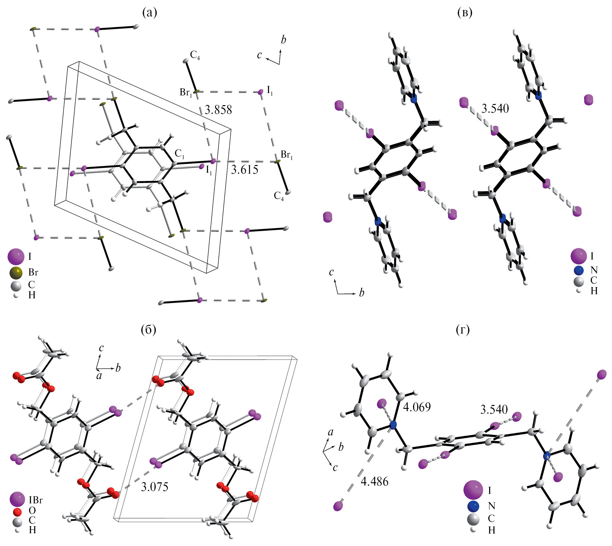Рис. 1. Фрагмент структур соединений 1 (а), 2 (б) и 3 (в, г). Разорванные линии обозначают галогенные связи, число указывает длину этой связи в ангстремах. Тонкие линии соответствуют кратчайшим расстояниям между анионами йода и положительно заряженными атомами азота.
