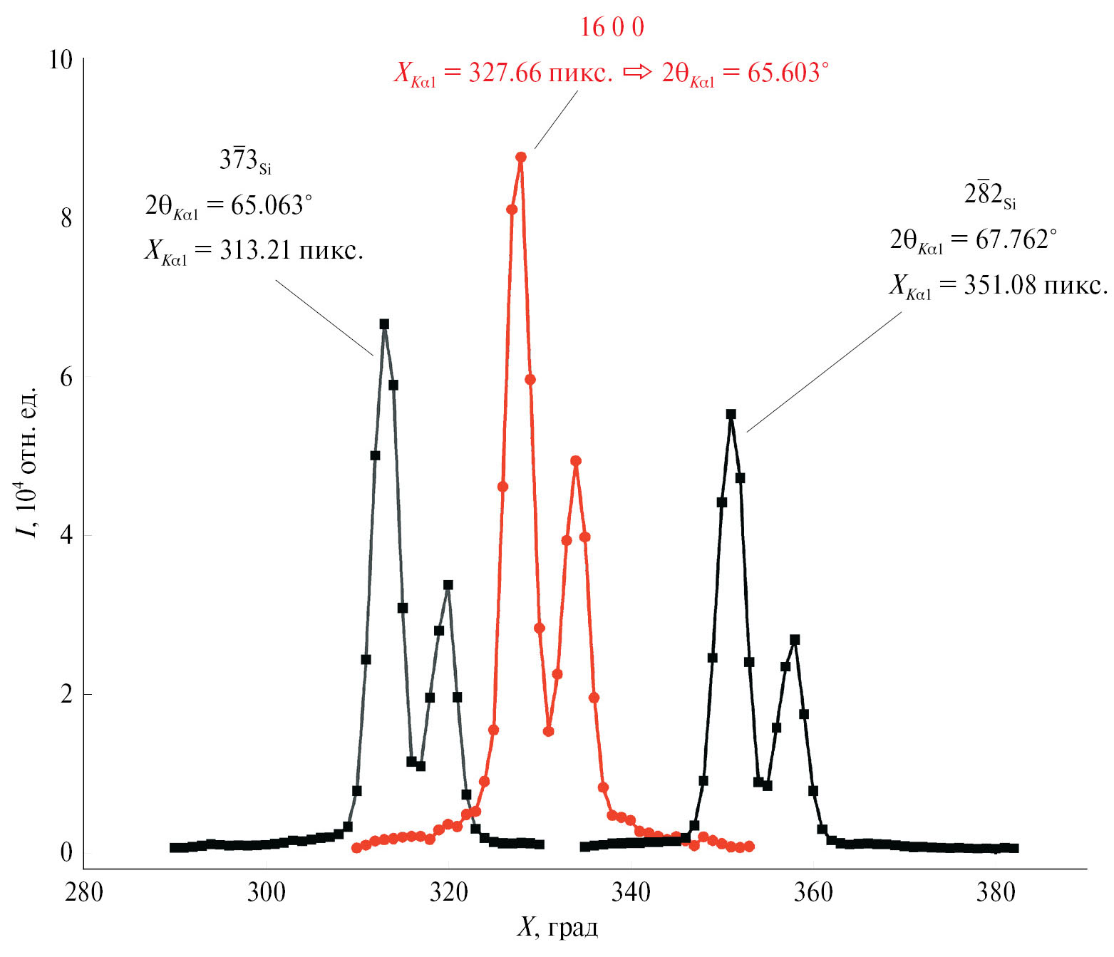 Рис. 2. Процесс уточнения параметров элементарной ячейки монокристалла 3 α-S при комнатной температуре по методике “Экватор”. Жирными линиями показаны плоские сечения двумерных профилей и Х-координаты максимумов двух рефлексов внешнего эталона. Отношение ∆2θ/∆Х определяет угловой размер пикселя γ и позволяет рассчитать угловое положение Kα1-составляющей рефлекса 16 0 0.